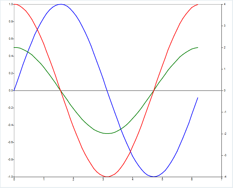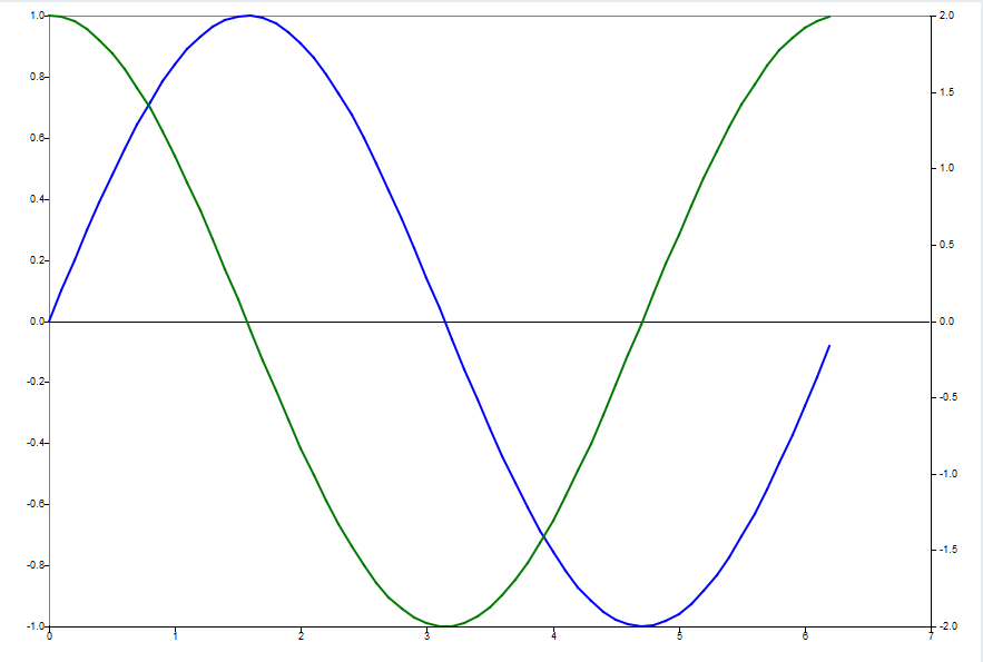[ax h1 h2] = plotyy(x, sin(x), x, 2*cos(x));
