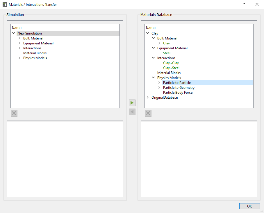 Materials and material interactions can be added to the database by transferring from an existing simulation.