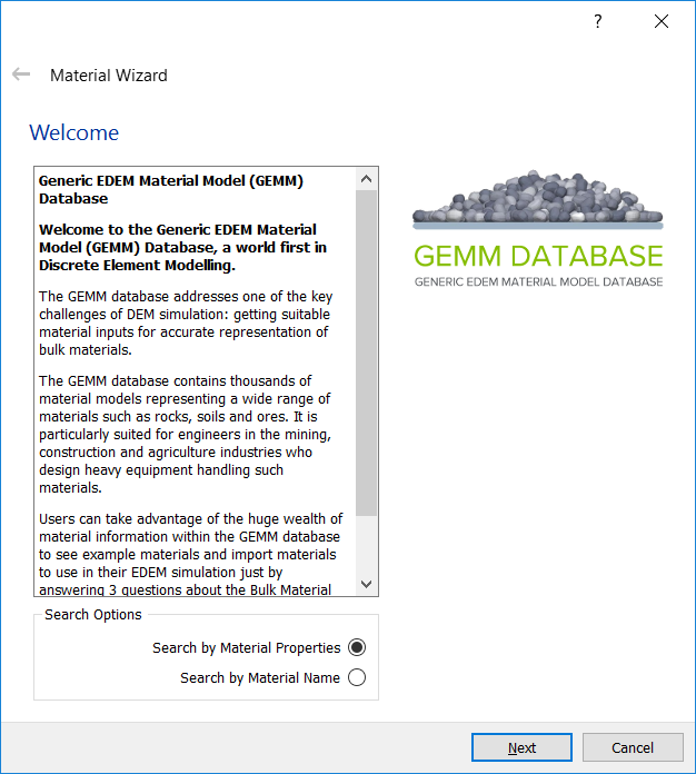 The first page is a description of the database, read, select Search by Material Properties and click Next to answer the 3 questions on the particle Bulk Material behavior.