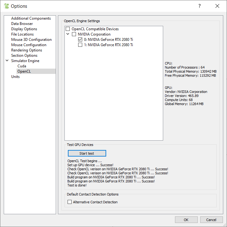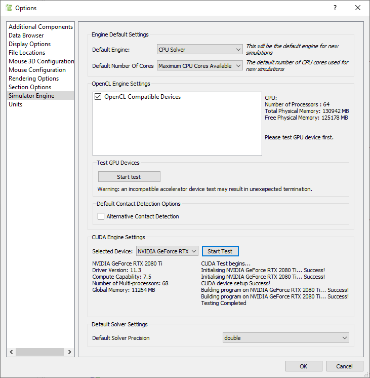 EDEM GPU OpenCL engine requires your GPU device to support OpenCL 1.2 or above. To check hardware compatibility with the GPU, go to Tools > Options > Simulator Engine > OpenCL and select the GPU’s from the list and then select Start test. As shown, EDEM will report if the test and GPU setup is successful. If multiple GPU devices are found, a test should be run on each GPU device required to run EDEM.