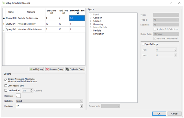 First setup a config query in the EDEM Analyst > File > Export Results data. Multiple export data Configs can be setup however only one can be used to output results in the Simulator.