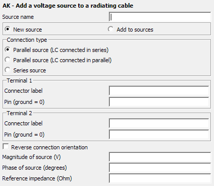 Figure 1. The AK - Add a voltage source to a radiating cable dialog.