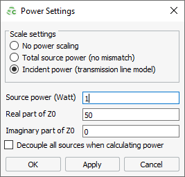Select the Decouple all sources when calculating power check box to ignore the mutual coupling for Hertzian electric / magnetic dipoles or impressed line current elements when calculating the source power.