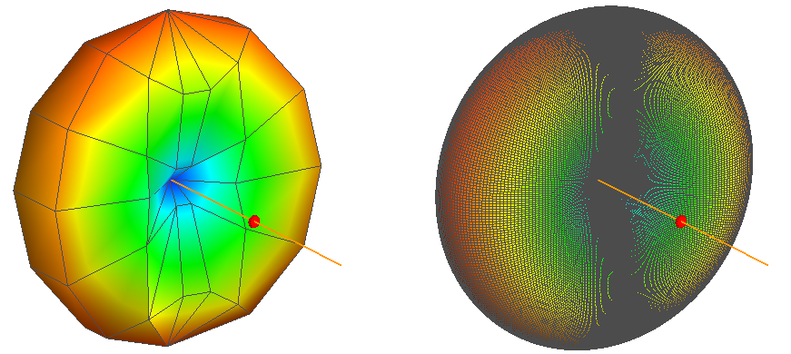 Figure 1. The result of a 3D pattern far field request with and = 13 points (on the left) and the result of a 3D pattern far field request with = 7 and = 13 points with the Calculate continuous far field data option selected (to the right).