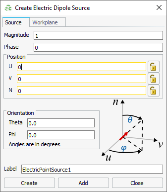 Apply an electric dipole source that represents an elementary dipole element with a specified orientation, magnitude and phase.