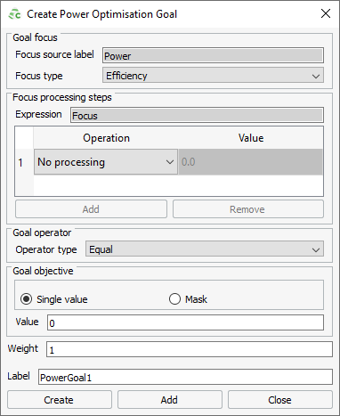 The Power goal allows optimisation of the total antenna efficiency, total power and power loss. The power goal does not accept any request name since it operates on the total power in the model.