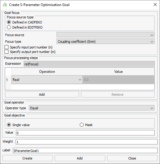 Note: If Snm and Smn are computed in an S-parameter request, then both of these values will be considered in the goal evaluation. If the coupling in one direction is required, the relevant port should be deactivated in the S-parameter calculation request (CADFEKO) or the source set to zero magnitude (EDITFEKO).