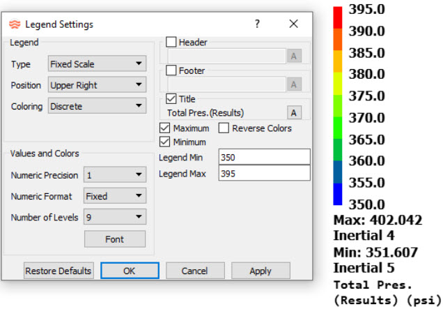 From the Contour/Transient Animation dialog, click Legend Widget Settings to display the Legend Settings dialog, where you can modify the legend settings for the color and animation options.