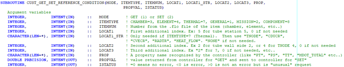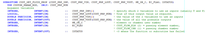 The comments in the file describe the subroutine arguments. The arguments are the typical values needed by the correlation. The arguments also include an array containing the user-defined inputs. The order of the inputs in the array are the same as the user defined inputs in the customization manager.