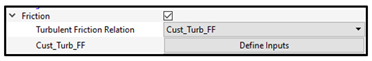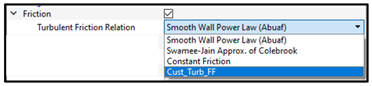 Once the custom correlation is created, it can be used in the element. Select the appropriate element type and property as shown in the table above. For instance, the “TURBULENT_FRICTION_FACTOR” subtype can be used in the Compressible Tube, Incompressible Tube, Advanced Orifice, and Turbulated Passage elements.