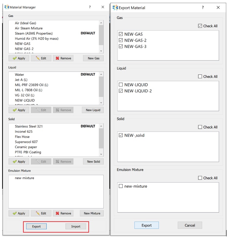 Figure 2. In the New Gas and New Liquid menus, many materials are listed under the following headings: