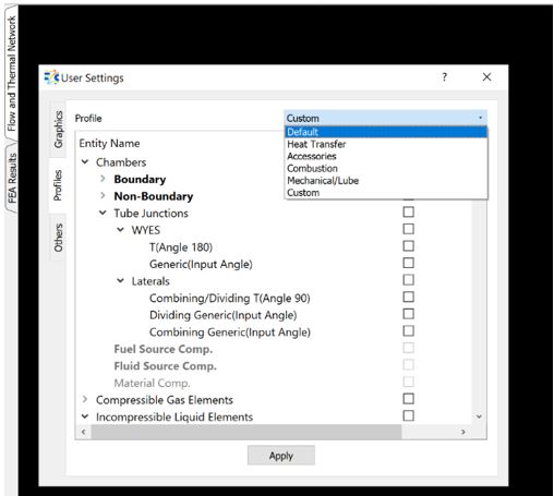 Users can modify the “Element Library” profile from this option. Based on the selected Profile option, the elements, chambers and components are listed in the element library. There exist 4 different preset profiles & one custom profile where users can create/contol display of elements in "Elements Library".
