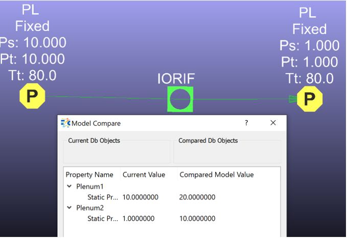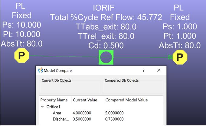 Example 1: The area and the Cd of the orifice element changed, and model comparison option shows the values for the current model and for the compared model.