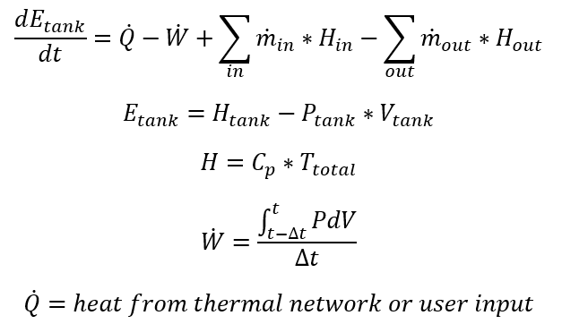 Note that the heat from thermal network or user input, can also be inferred from the user input for polytropic index, n. If n=1, the Q=W and the temperature is only a function of the heat capacity of the fluid in the tank and the energy of the fluid entering the tank. Other properties of the tank are solved as follows