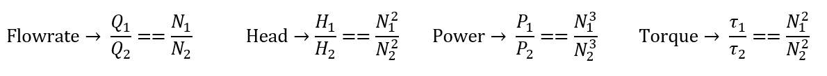 Where N = Speed, Q = Flow rate, H = Head, P = Power, τ = Torque