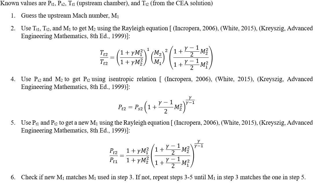 In the combustion element, the total pressure loss due to combustion heat addition is modeled by satisfying the Rayleigh equations. Total pressure loss due to heat addition is typically small (less than 1 psi). Flow Simulator combustion elements use an iterative procedure to calculate pre- and post-combustion Mach numbers. The procedure is as follows