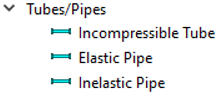The three elements shown here: Incompressible Tube, Elastic Pipe, and Inelastic Pipe, fall under the category of Incompressible Tubes. These elements solve the 1D Navier-Stokes equations with the option to incorporate friction, heat transfer, area change, rotation, buoyancy, and bend geometry effects.