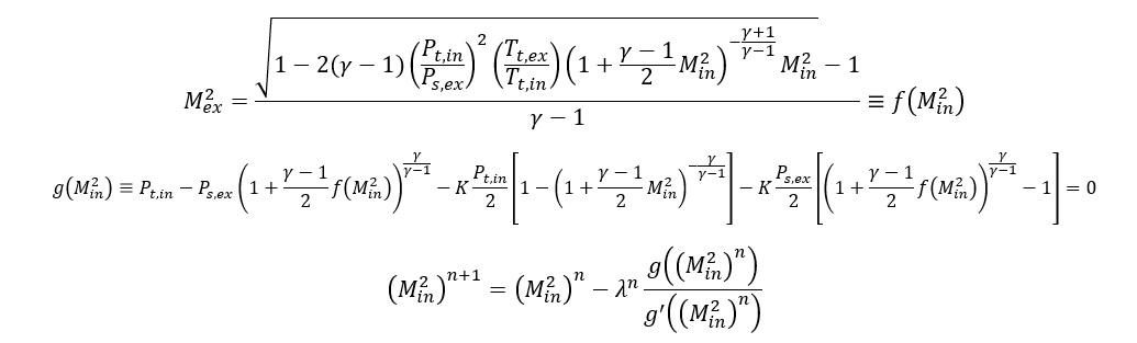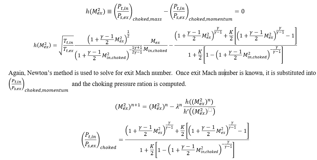 Next, we re-introduce the mass continuity equation and the momentum balance equation. However, this time we rearrange and solve for pressure ratio and we substitute inlet Mach number that corresponds to choked at the artificial choking throat area.