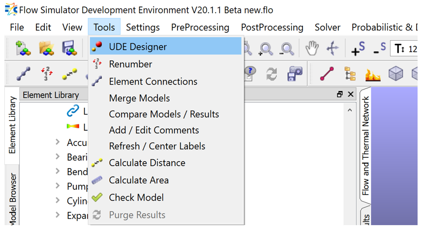 User Defined Elements (UDE) allow users to create elements with custom formulations (Mass, Momentum & Energy equations). Users can use Python or Fortran programming language to create their own element formulations. UDE’s are integrated into GUI and once created UDE can be used like other Flow Simulator elements. Moreover, Flow Simulator allows users to share UDE’s among models.