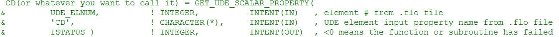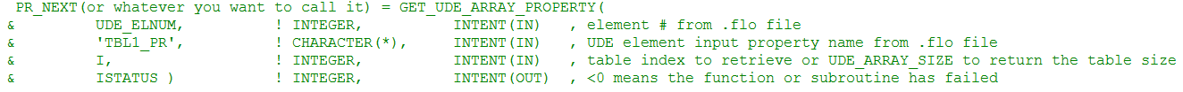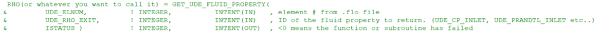 | GET_UDE_FLUID_PROPERTY | Function returns flow element fluid properties at the upstream, downstream and an average. It returns a double precision number. These may or may not be needed for the flow calculation. |