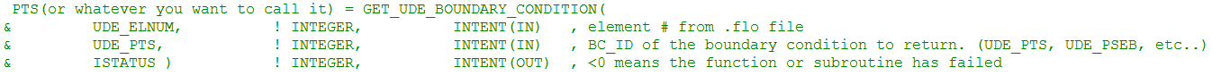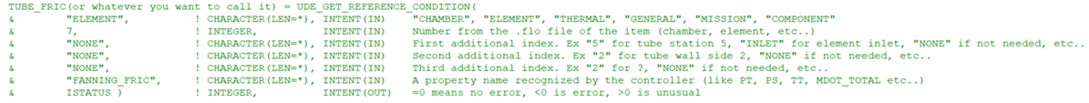 | GET_UDE_BOUNDARY_CONDITION | This function returns flow element upstream and downstream boundary conditions such as PTS, PSEB, THETA_INLET, PHI_EXIT, etc. It returns a double precision number. These are usually used for the flow calculation. Typical BC_ID: UDE_PTS, UDE_TTS, UDE_PSEB, UDE_RELANGL, UDE_THETA_INLET, UDE_PHI_INLET, UDE_THETA_EXIT, UDE_PHI_EXIT |