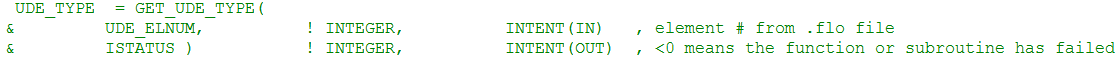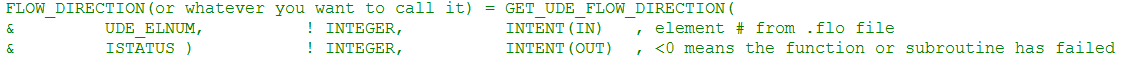 | GET_UDE_FLOW_DIRECTION | Function returns the flow direction as determined by the solver. It returns an integer. Return values are -1, 0, 1. Parameters REVERSED_FLOW_DIRECTION=-1, FORWARD_FLOW_DIRECTION=1, UNDEFINED_FLOW_DIRECTION=0 are available for clearer code. |