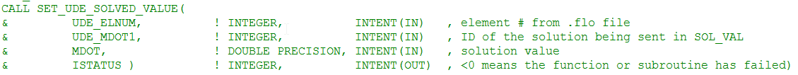 | SET_UDE_SOLVED_VALUE | Subroutine returns the results to the main solver. Valid SOL_ID: UDE_MDOT1, UDE_TT_EXIT, UDE_VEL_EXIT, UDE_D_MDOT1_D_PTS, UDE_D_MDOT1_D_PSEB UDE_MDOT1 is the only required solution, the others are optional. |