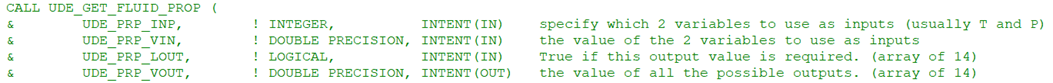 | UDE_GET_FLUID_PROP | Subroutine will get fluid properties based on 2 supplied input properties (like pressure and temperature). The fluid type is always based on the fluid type entering the element. |