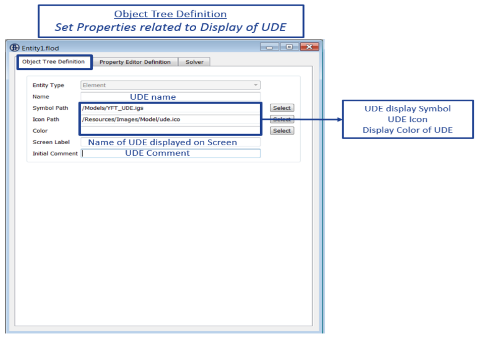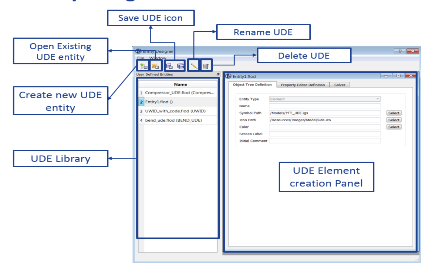 The Entity Designer windows allows you to create, save, open, delete UDE element. It also provides interface for object tree definition, create Input parameters & Provide interface to write a Python Script for a solver.