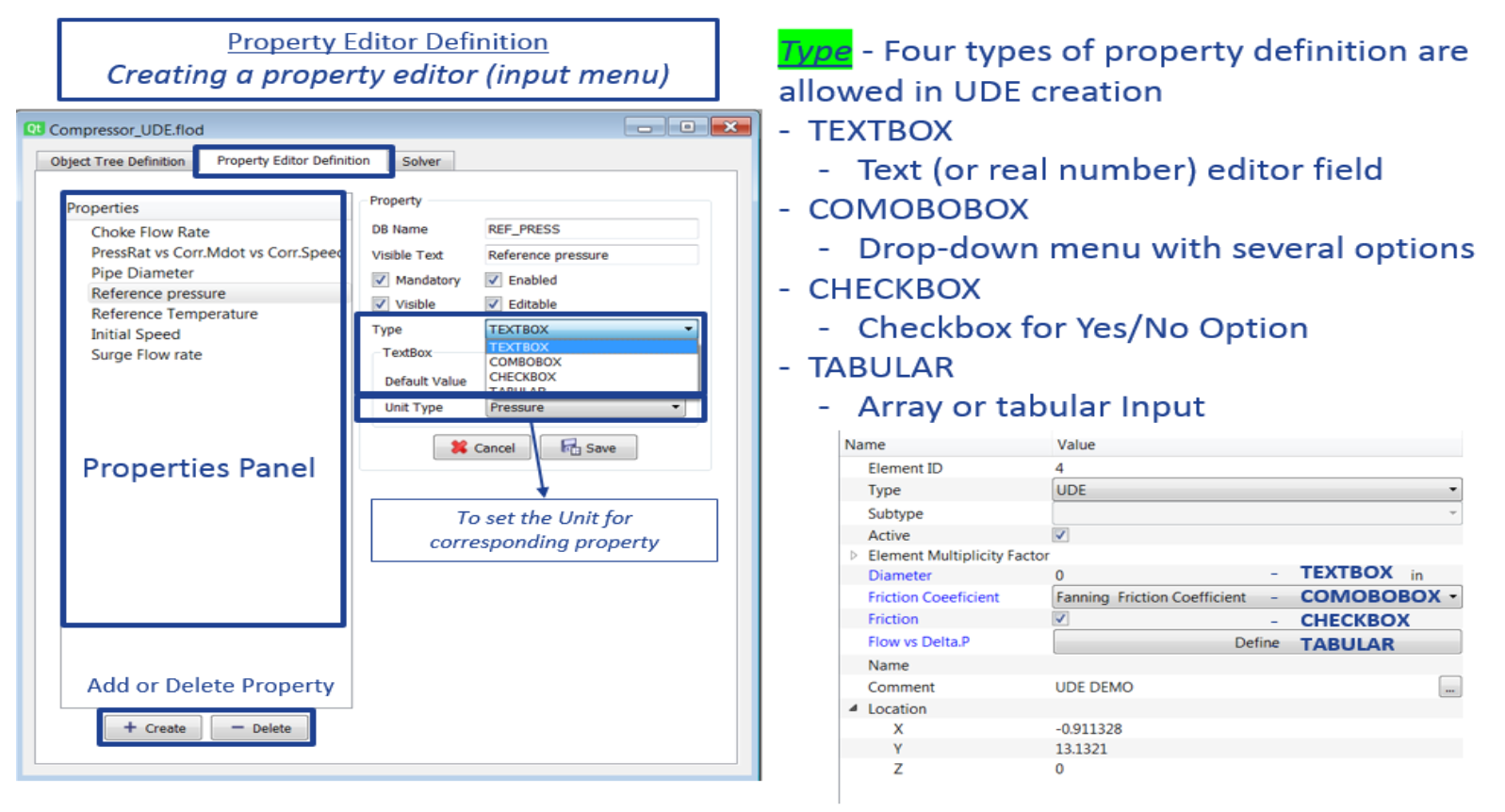 Flow simulator allows users to create user defined element. Users can create different category of inputs like text fields, tabular inputs, combo box & checkbox using entity designer user interface. To Access the UDE go to Tools menu UDE as shown in the image. Moreover, you can see the predefined UDEs at the bottom section of the Element Library.