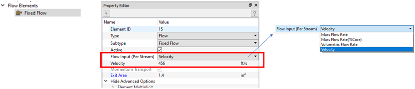 - The fixed flow element has an option to enter the velocity of the flow. Previous versions had options for mass and volumetric flow rates. The velocity option requires a flow area to be entered, too.