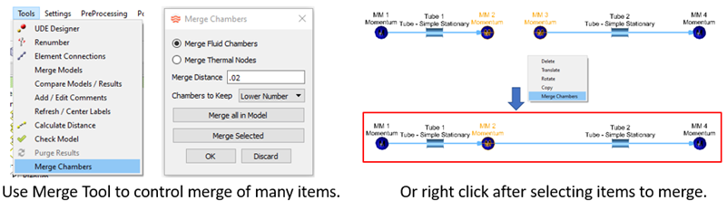 - You can automatically merge chambers or thermal nodes that lie close to one another. This is useful if duplicate chambers exist after copying a group of elements. It can also be used if automatic element creation using CAD leaves two disconnected elements that should be connected. Use Discard or Undo if there are problems with the merge.