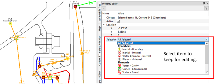 - A selection filter is available in the Property Editor to specify which items remain selected for editing. You can select multiple items, sweeping across the screen while clicking the left-mouse button. For example, use the filter to only keep chambers.