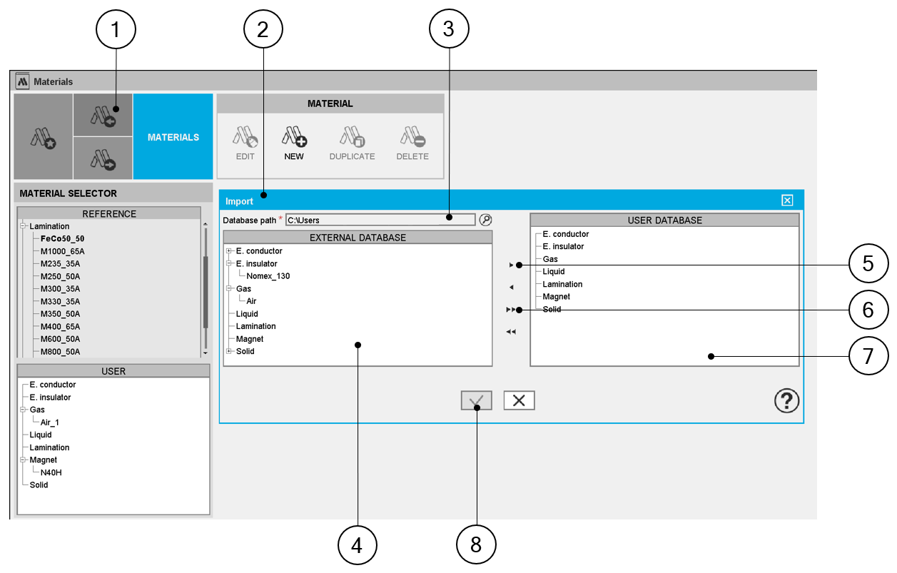 It is possible to import materials from external material database built by another user of FluxMotor®. All the imported materials will be stored in the user material database.