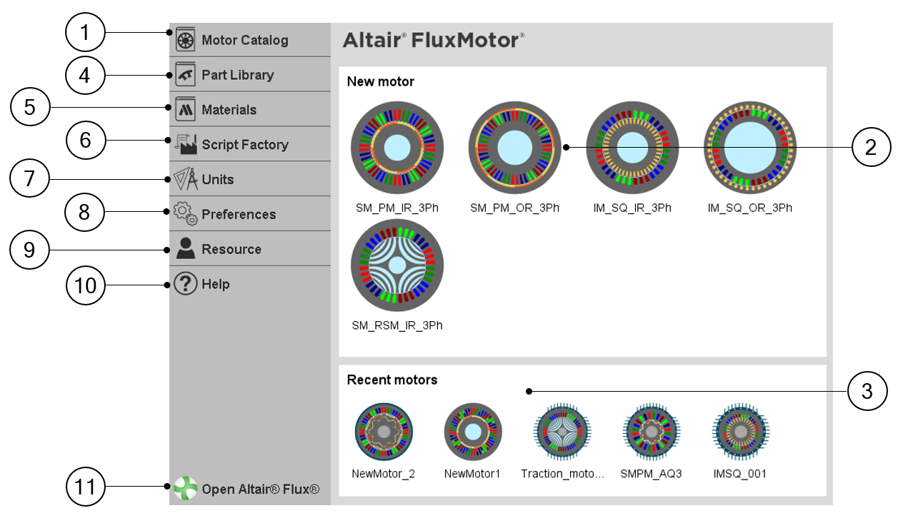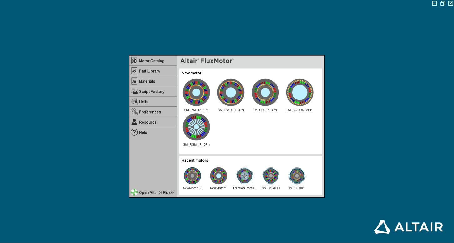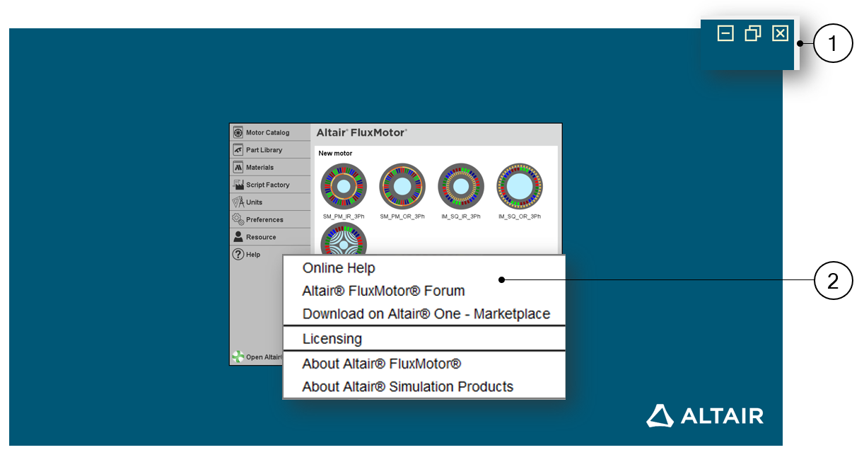 This gives access to Online help, Licensing system and information about FluxMotor® and Altair Simulation Products