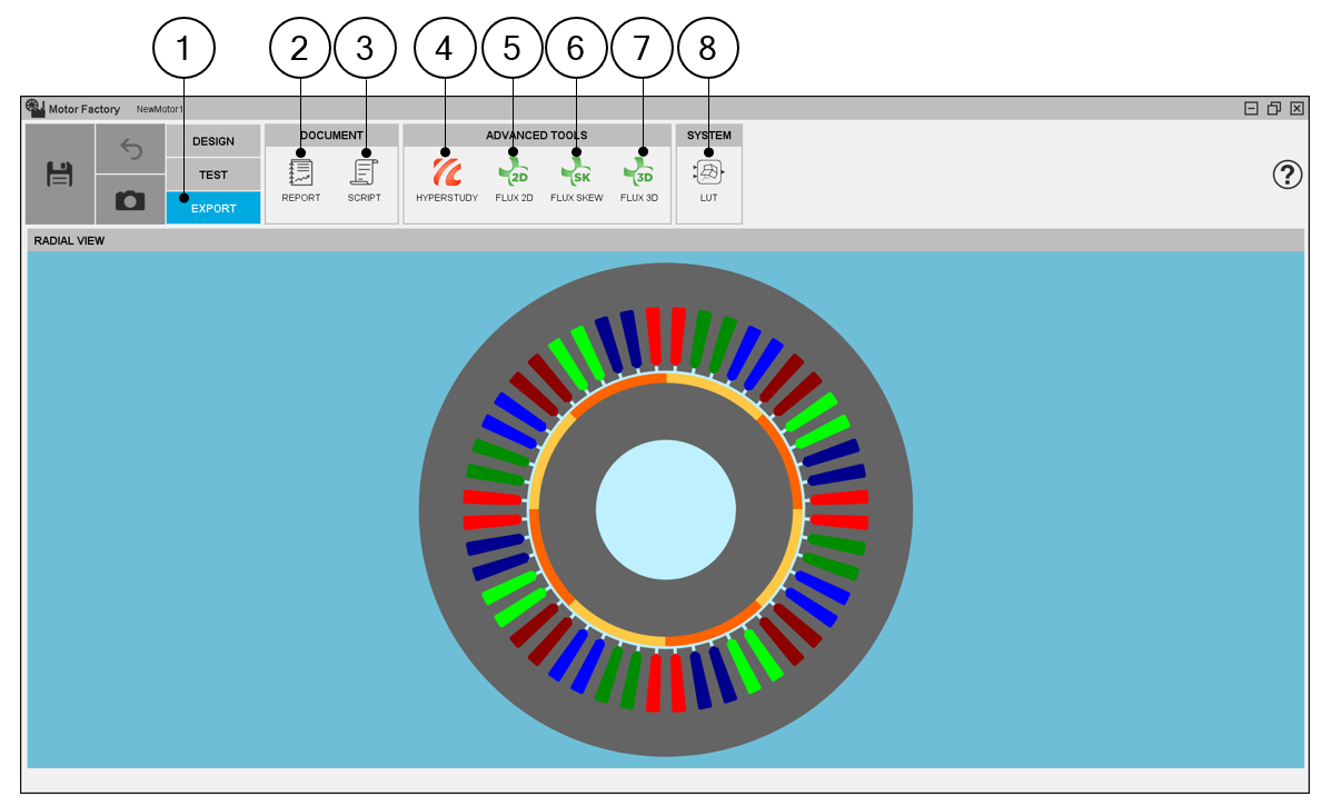 Then, the functions “FLUX2D”, Flux Skew, Flux 3D allow to build and export a model in Altair® Flux® environment (2D, Skew or 3D) for performing advanced studies either with magneto static or transient applications.