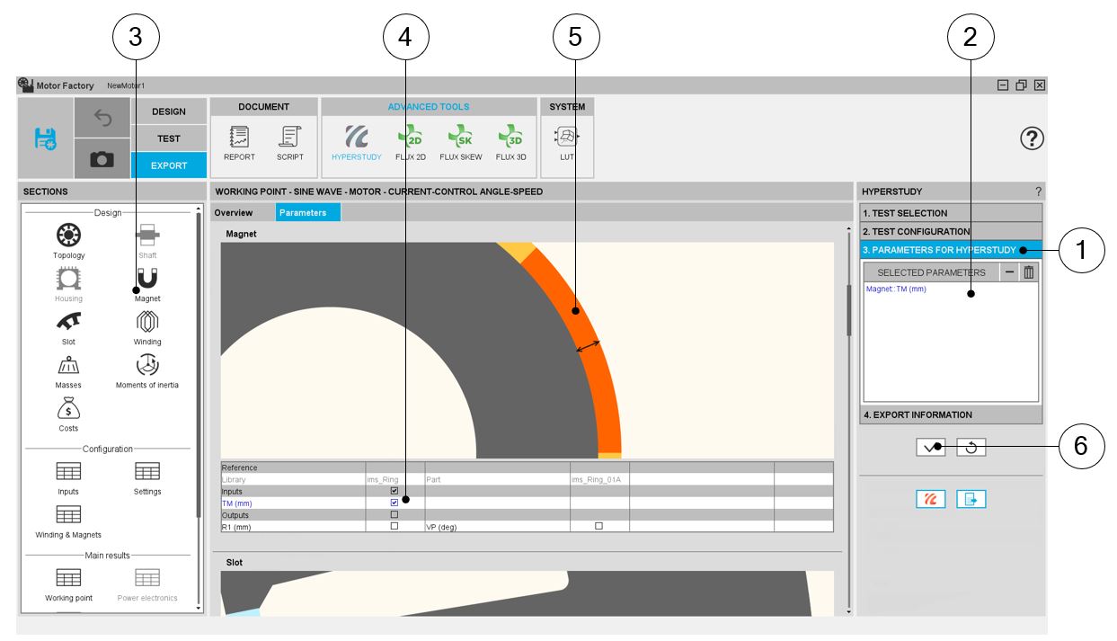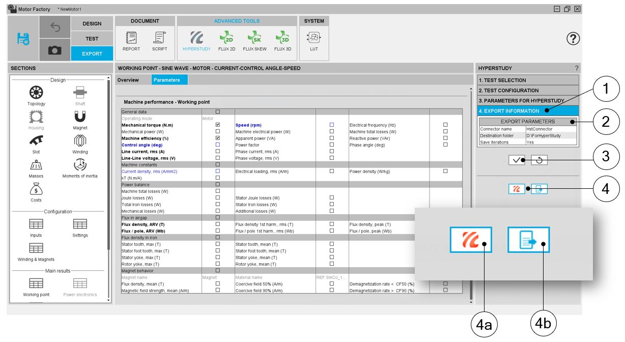 When one clicks on this button (4a), HyperStudy is automatically opened, with the connector built by FluxMotor uploaded.