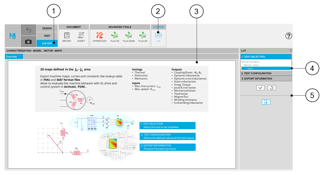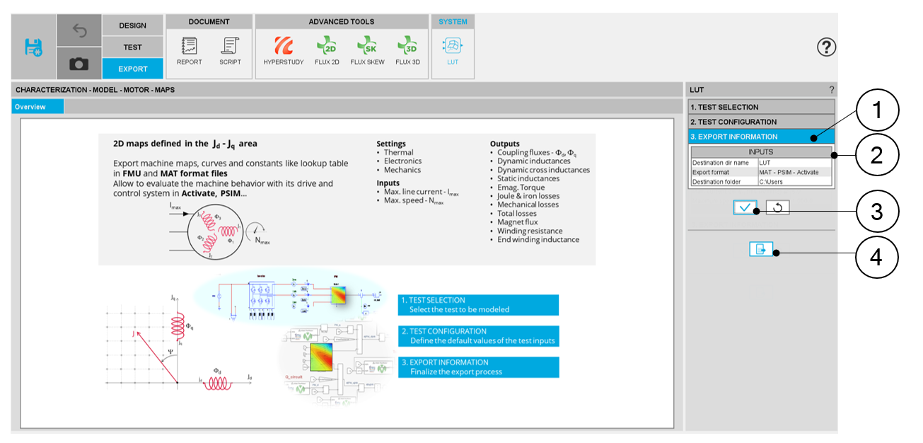 The area SYSTEM, in the EXPORT environment of Motor Factory, allows exporting data like constants, curves and maps in lookup table (LUT) formats, such as FMU and MAT format files.