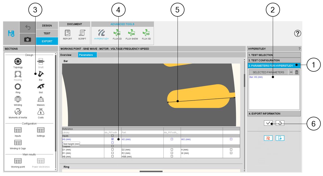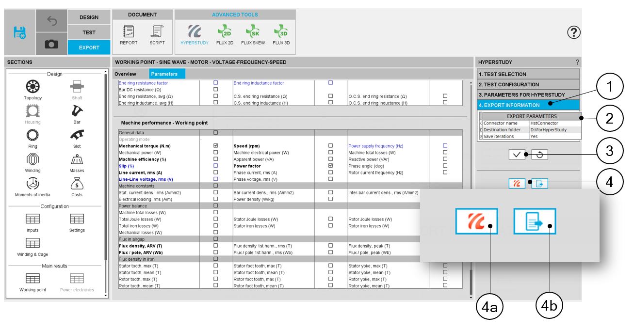 When one clicks on this button (4a), HyperStudy is automatically opened, with the connector built by FluxMotor uploaded.