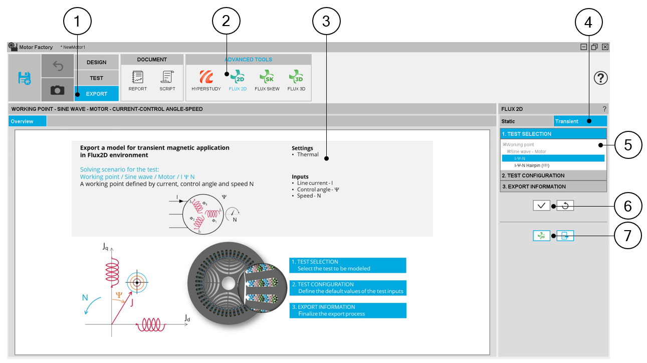 Motor Factory – EXPORT AREA – Export model for Flux® 2D environment 1 Select application (STATIC or TRANSIENT) in which the model must be built in Flux® 2D 2 Choose one scenario (or test) to be provided 3 Define the initial conditions for the simulation process in Flux® 2D environment 4 Define export information