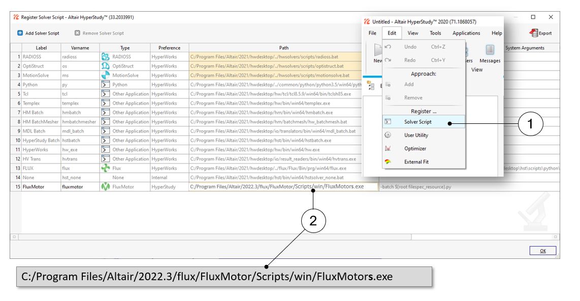 Connection between Altair® FluxMotor® and Altair® HyperStudy® 1 Open the area in HyperStudy® to register FluxMotor® 2022.3 script 2 Path where FluxMotors.exe must be selected to be registered as a new solver in HyperStudy®.Note: FluxMotors.exe with an “s” at the end of FluxMotors.This must be defined only when using the coupling for the first time.