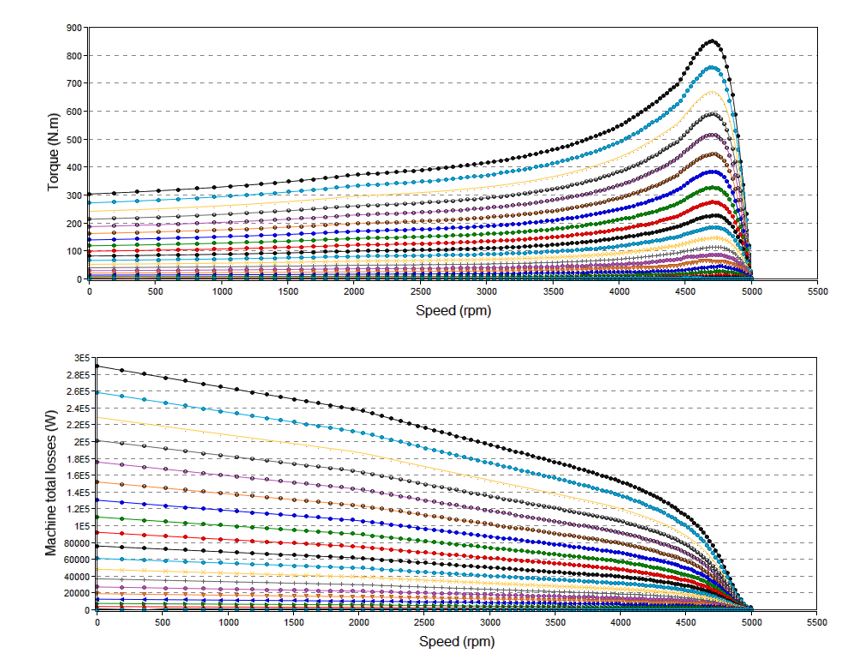 The main outputs are displayed as curves versus speed for a set of Line-Line voltage (U) and a set of power supply frequency (f) such as Mechanical torque, Mechanical power, Machine efficiency, System efficiency, Machine electrical power, System electrical power, Machine total losses, System total losses, Stator total losses, Rotor total losses, Mechanical total losses, Power electronics losses, Power factor, Stator current