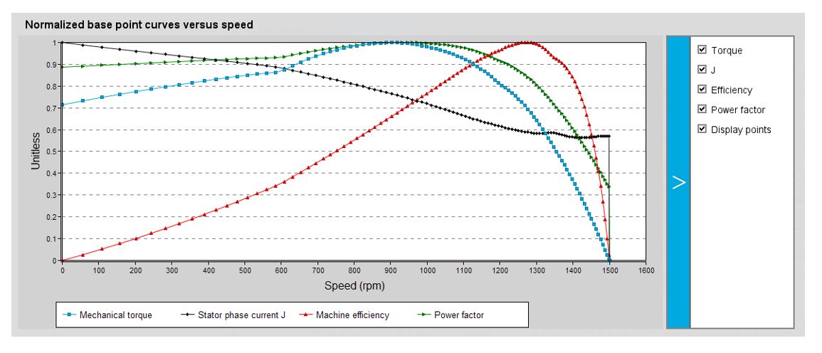 Some outputs, like torque, current, efficiency, and power factor are also displayed as the normalized base point curves.