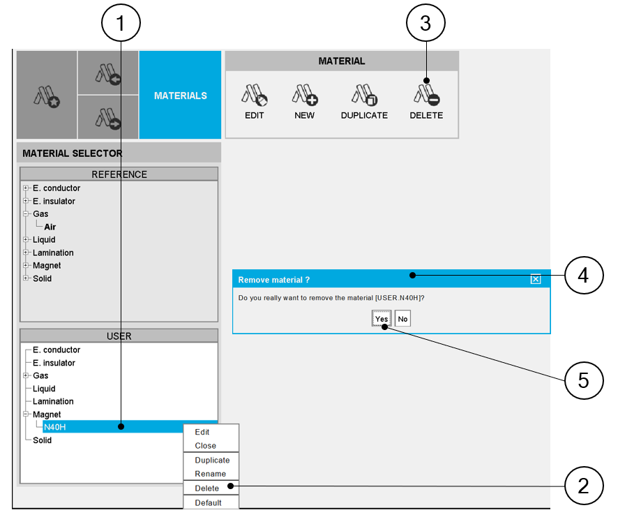 3 | The second way to delete a material consists of clicking on the “Delete” button in the area where several functions are located at bottom part of the user material database to manage the materials. |