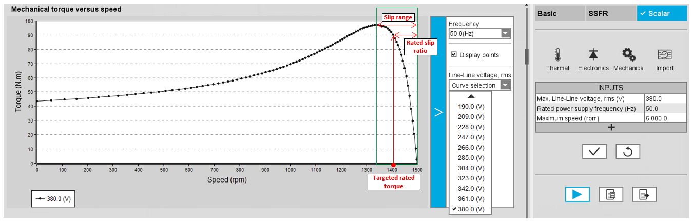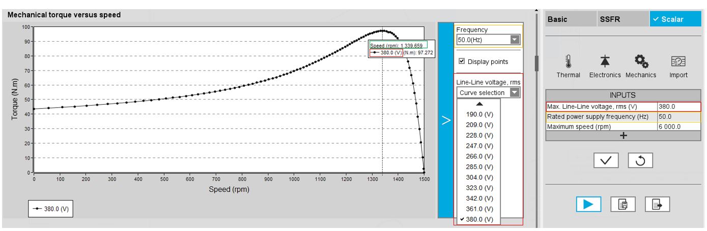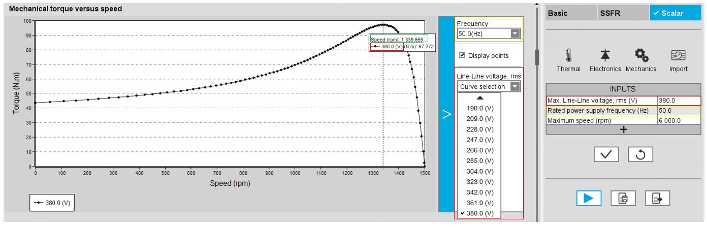 From the “Mechanical torque versus speed” curve, selection of the rated power supply frequency value