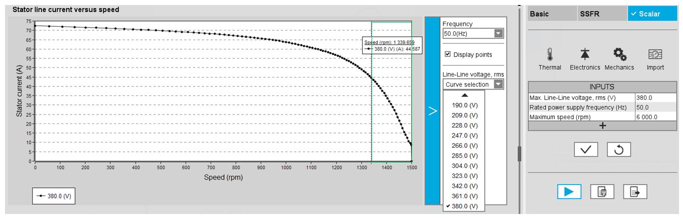 From the “Stator line current versus speed” curve, selection of the maximum current value