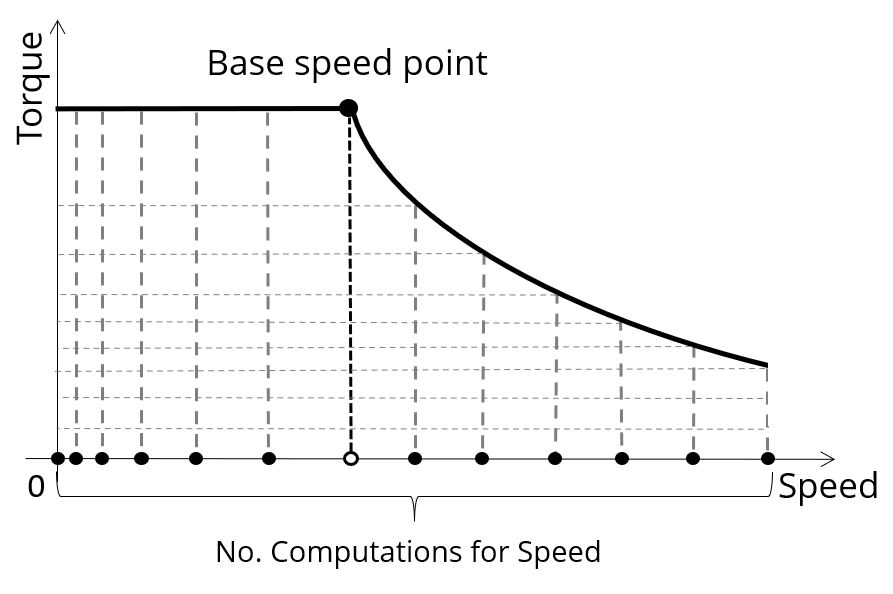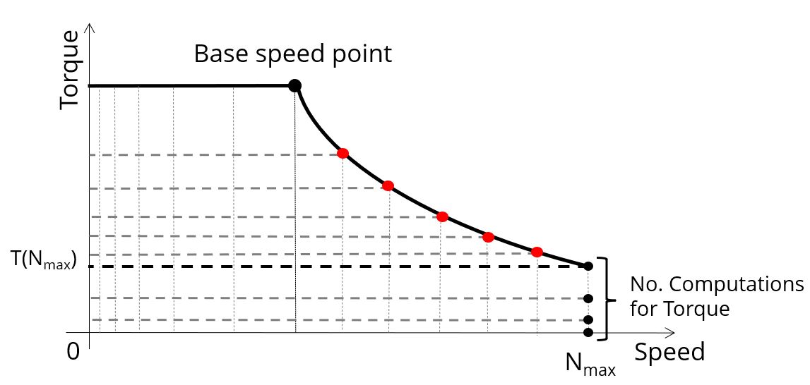 For the speed range [Nbase; Nmax.], the number of computations for torque is imposed by the number of computations for the defined speed range [Nbase; Nmax.] (Red points in the image shown below).