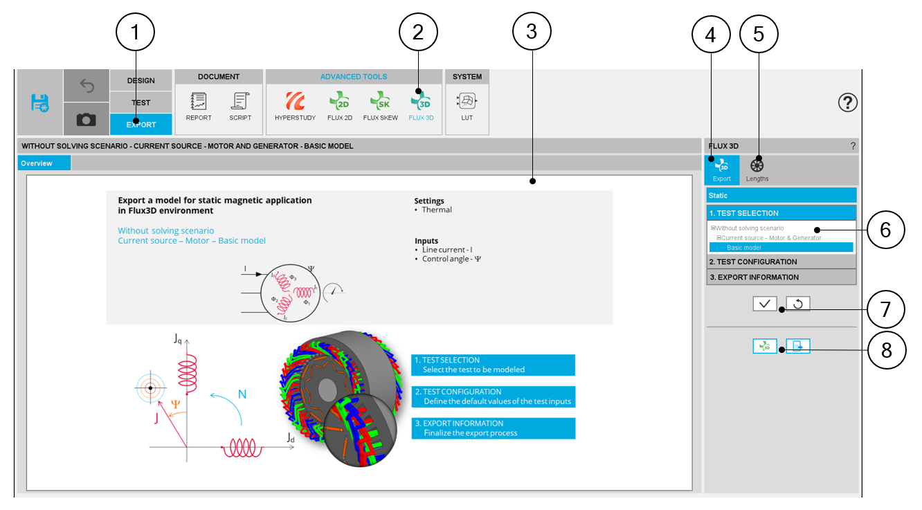 8 | Buttons to export the python file for building the model in Flux® 3D environment or to launch directly Flux® 3D. |