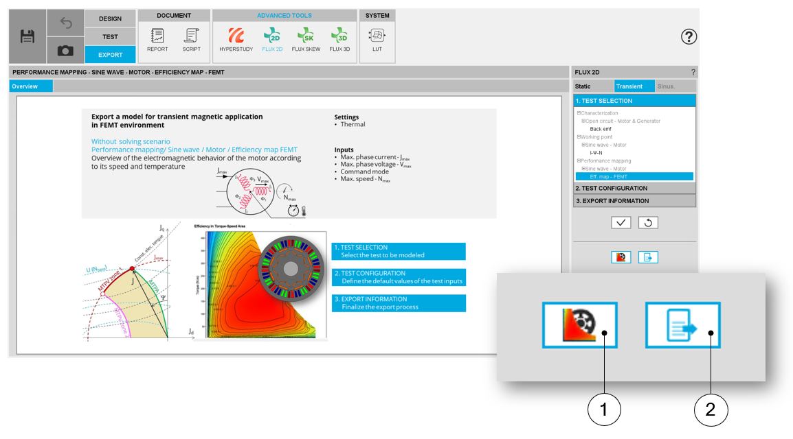 One button (1) allows to launch Flux® 2D (Flux e-Machine Toolbox (FeMT)), directly and automatically, and build the model.