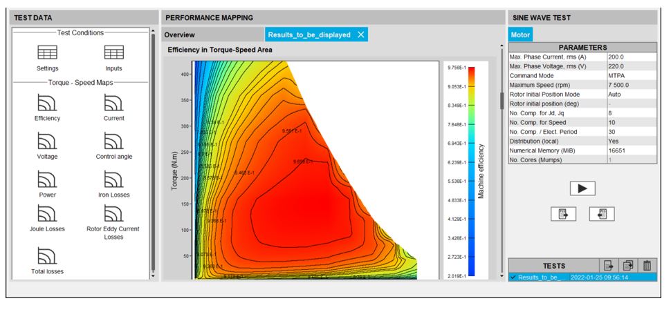 The aim of the test “Performance mapping – Sine wave – Motor – Efficiency map - FEMT” is to characterize the machine efficiency map, launching a set of transient simulations which allows very high accuracy.
